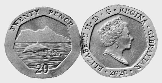 The latest Gibraltar 2020 20p coin featuring the Rock of Gibraltar and Dolphin. The obverse depicts Queen Elizabeth II.