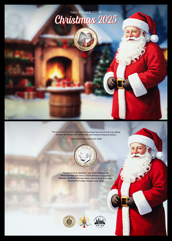 The Gibraltar Christmas 2025 £2 coin depicts an image of Father Christmas with the Rock of Gibraltar in the background. The obverse depicts the effigy of His Majesty King Charles III.