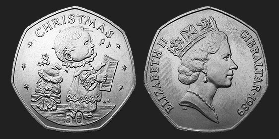 The 1989 Christmas 50p coin features a portrait of HM Queen Elizabeth II on the obverse, whilst the reverse features a child singing Christmas carols, accompanied by Christmas imagery.