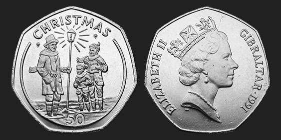 The 1991 Christmas 50p coin features a portrait of HM Queen Elizabeth II on the obverse, whilst the reverse features carol singers of various ages.