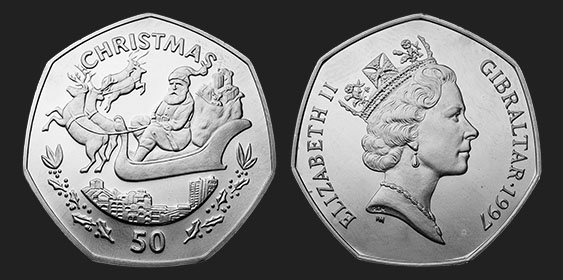 The 1997 Christmas 50p coin features a portrait of HM Queen Elizabeth II on the obverse, whilst the reverse features Santa Claus, or Father Christmas delivering gifts with his reindeer-driven sleigh over a city scape, and accompanied by a wreath of holly.
