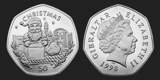 The 1998 Christmas 50p coin features a portrait of HM Queen Elizabeth II on the obverse, whilst the reverse features Santa Claus, or Father Christmas on a rooftop going down a chimney with a background of Gibraltar's Cathedral of St. Mary the Crowned, and accompanied by a wreath of holly.