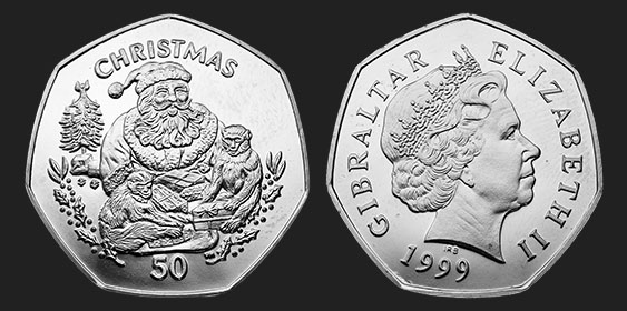 The 1999 Christmas 50p coin features a portrait of HM Queen Elizabeth II on the obverse, whilst the reverse features Santa Claus, or Father Christmas preparing gifts with the help of two Barbary Macaques, and accompanied by a wreath of holly.