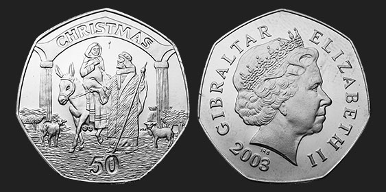 The 2003 Christmas 50p coin features a portrait of HM Queen Elizabeth II on the obverse, whilst the reverse features a Joseph and a pregnant Mary atop a donkey, having arrived at the manger.