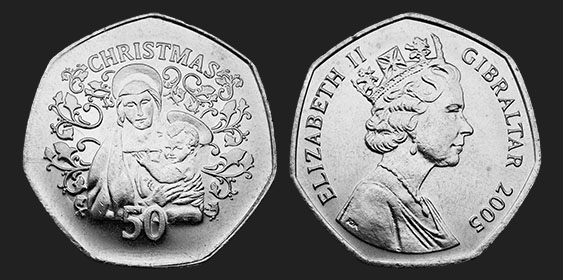 The 2005 Christmas 50p coin features a portrait of HM Queen Elizabeth II on the obverse, whilst the reverse features Mary holding an infant Jesus, surrounded by greenery.