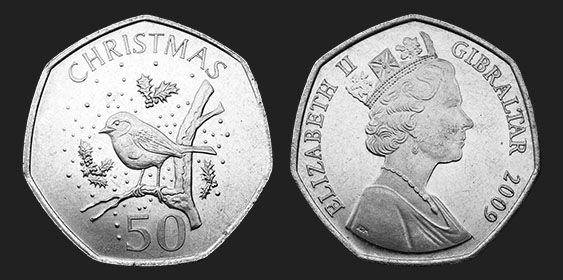 The 2009 Christmas 50p coin features a portrait of HM Queen Elizabeth II on the obverse, whilst the reverse features a robin on a tree branch.